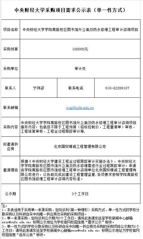 中央财经大学学院南路校区图书馆外立面及防水修缮工程审计咨询项目需求公示